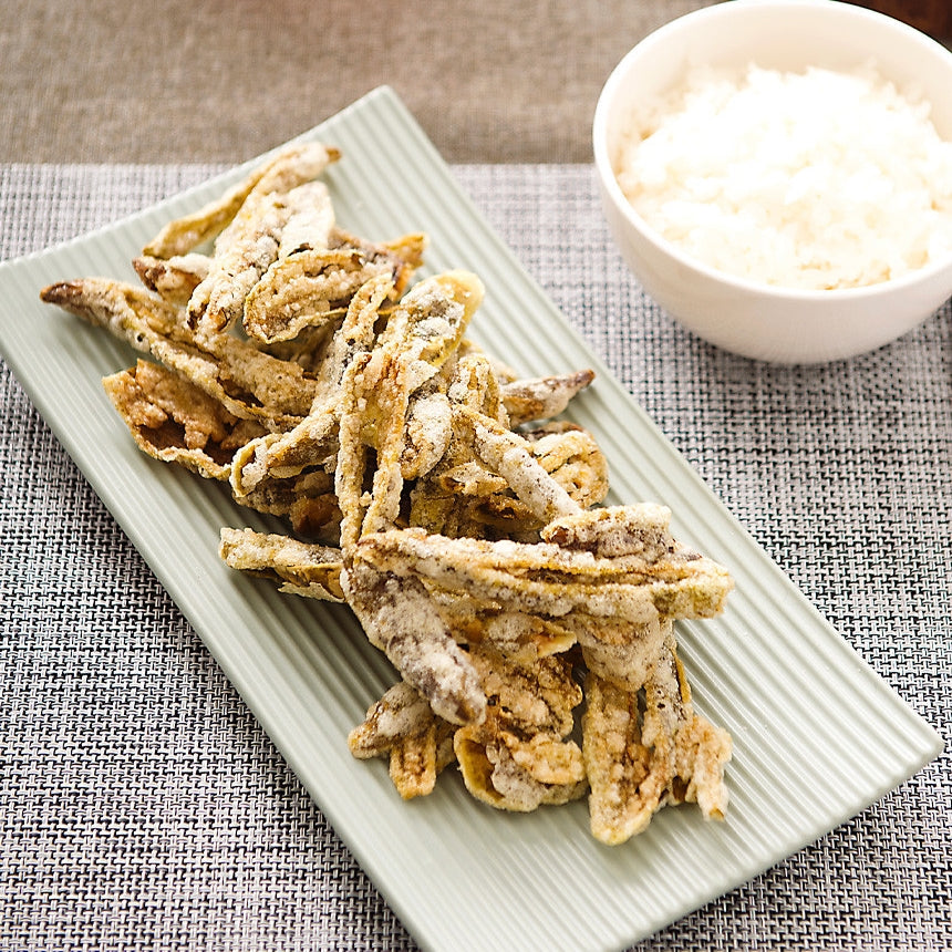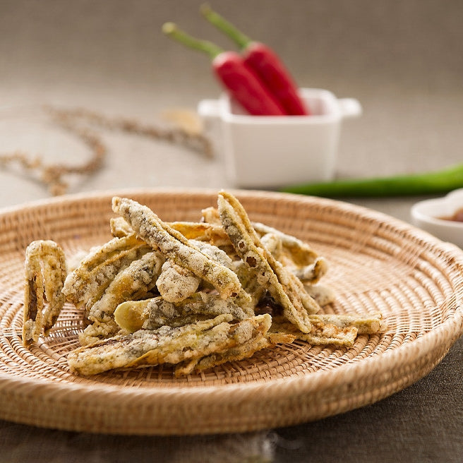 Korean spice captured in a tasty crispy snack! Crunchy, sweet, and lightly salted with no MSG. Freshly harvested Korean chili peppers are first brined in deep seawater rich in minerals and organic nutrients such as phosphoric acid, nitric acid, and silicic acid. This gives the peppers a delightfully light and slightly salty flavor. The peppers are then battered in glutinous rice and fried in sunflower oil adding a sweet, light taste in the final crisp! Delicious and nutritious, these pepper chips are a must-try!