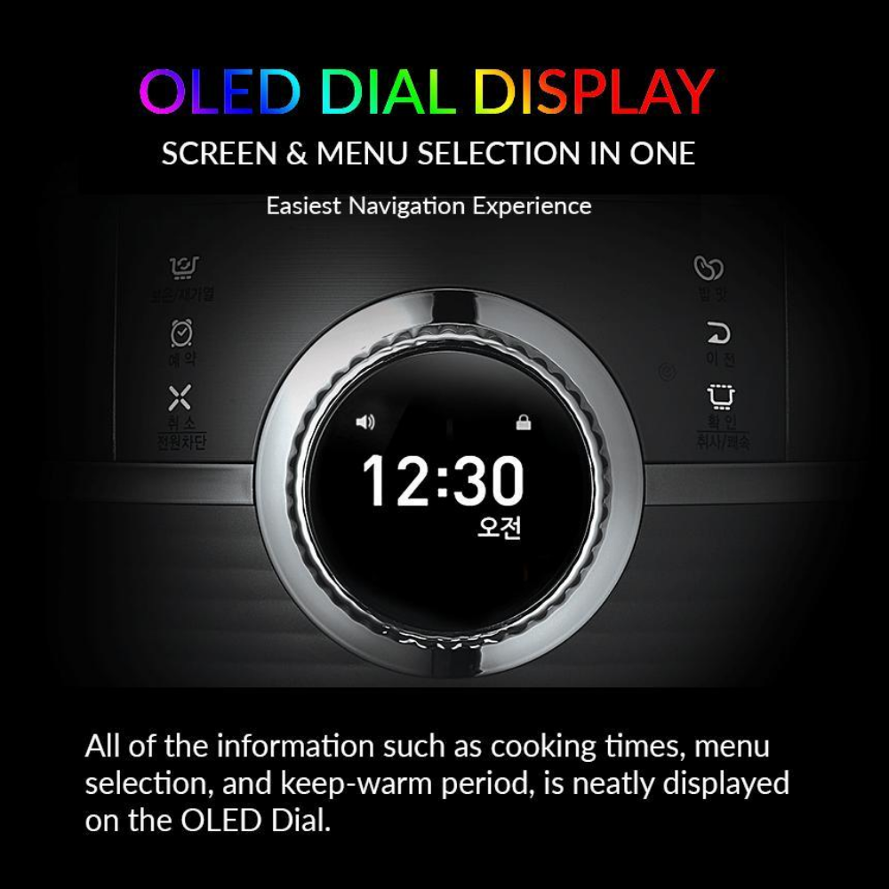 An easy to read OLED Dial Display features a voice navigation system in English, Korean, and Chinese as well as a smart dial for quick menu selections. These selections include preset modes for 7 different types of rice to accommodate specific cooking times and temperatures. The precise heat control is regulated by IR sensor technology for controlled, even heating efficiency. Also features quick speed cooking (mixed rice: 29 min), power-saving mode, and a convenient, noise-free steam vent!