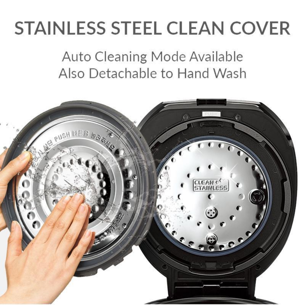 The “Smart” Keep-Warm system keeps the temperature regularity by detecting the outside and inside temperatures of the cooking pot. The “Reserve” Keep-Warm system minimizes loss of moisture to evaporation to prevent drying and discoloration of rice. The one-touch auto cleaning makes cleaning an absolute breeze! Simply add a little water into the pot and select “auto-cleaning.” High-pressure steam cleans every spot and prevents clogging in the nozzles. The stainless steel cover is also detachable for hand washing.