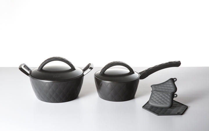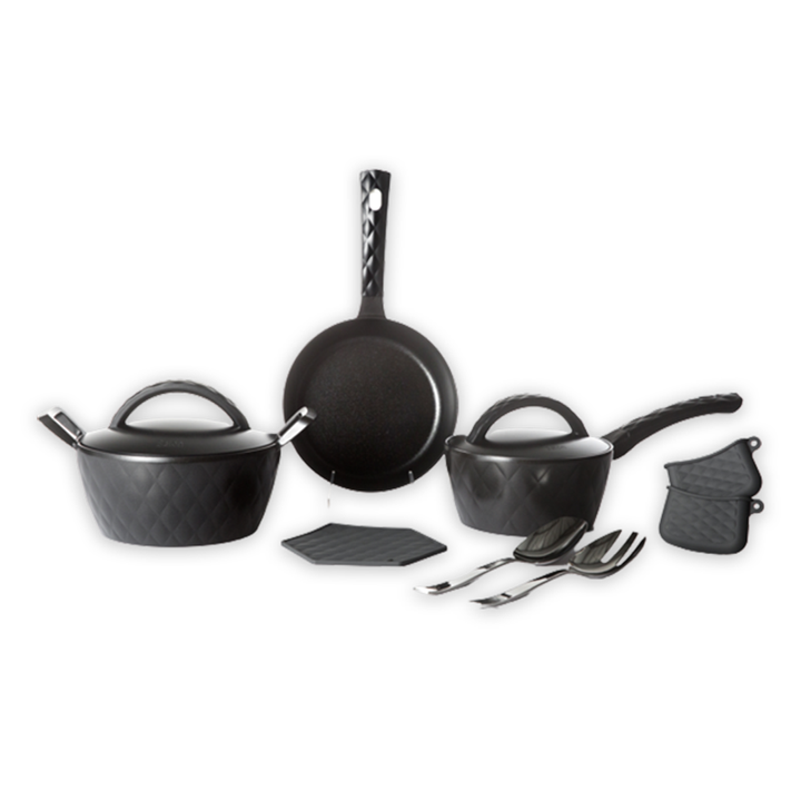 - 18cm 편수냄비 (뚜껑포함) - 22cm 양수냄비 (뚜껑포함) - 22cm 프라이팬 (* 22cm 양수냄비 뚜껑과 호환 가능) <추가구성> - 실리콘 손잡이 2개 - 살롱 실리콘 받침 - 살롱 스테인리스 서빙 키친툴 2종 (서빙 스푼, 서빙 포크)